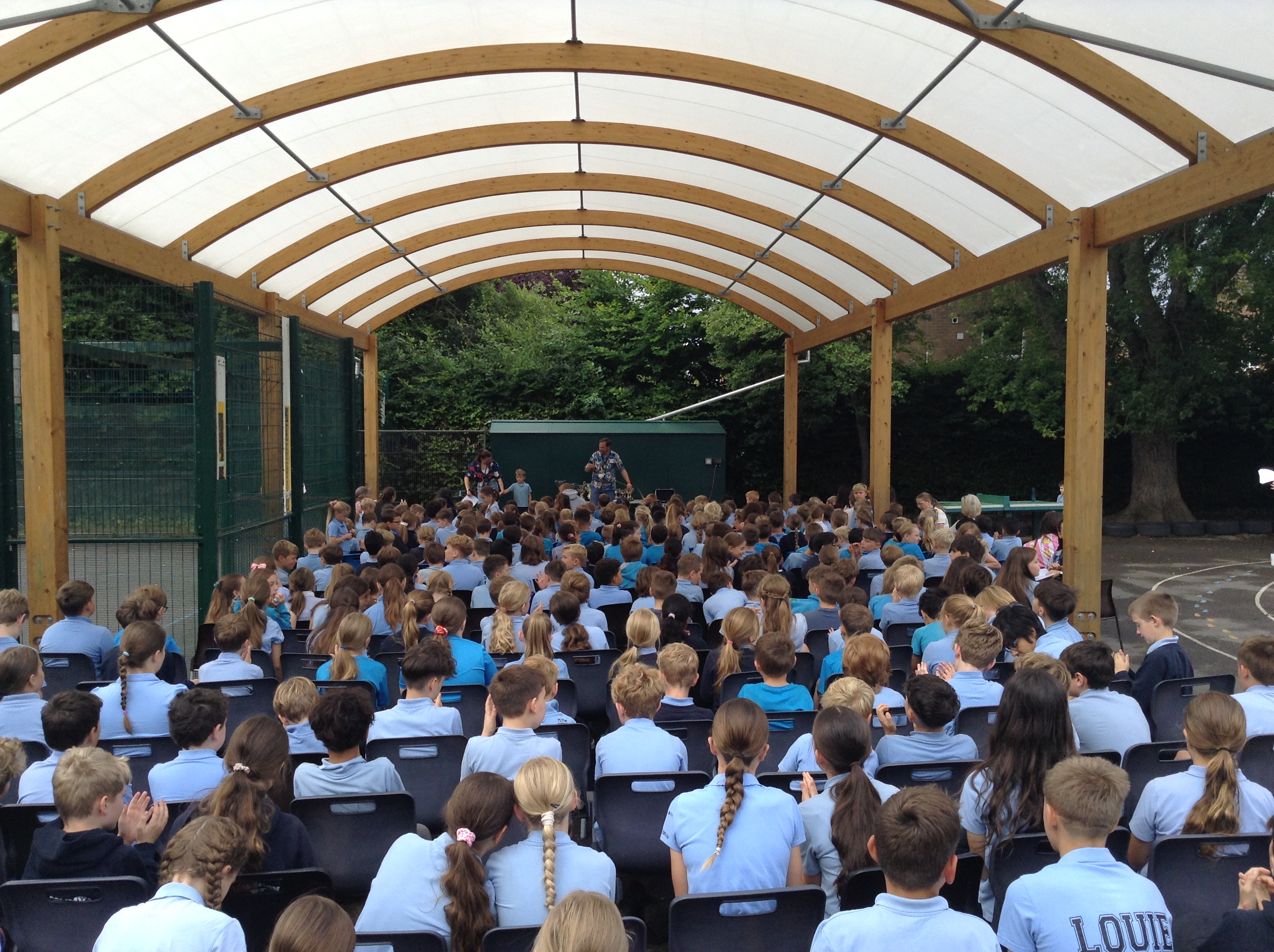 The whole school gathered under the canopy for a final assembly yesterday to celebrate everyone who won trophies and Headteacher’s Awards. We waved goodbye and good luck to Miss Lunnon, who is going to teach at a school in Sutton Courtenay; Mrs Meredith, who is retiring after 35 years of working at SCPS; Madame Baillie, who is starting a teacher training course; Mrs Ash, who is not coming back after her maternity leave; and Mr Sayer, who will be travelling the world.
